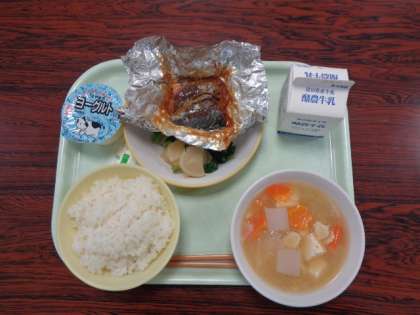 今日の献立は、ご飯 打ちまめ汁 鯖の銀紙焼き かぶの彩り ヨーグルト 牛乳 でした。
