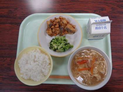 今日の献立は、ご飯 中華かき玉汁 魚と大豆のねぎソースからめ ゆでブロッコリー 牛乳 でした。