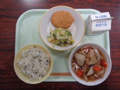 今日の献立は、わかめご飯 冬至の根菜汁 かぼちゃのコロッケ ゆず和え 牛乳 でした。