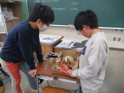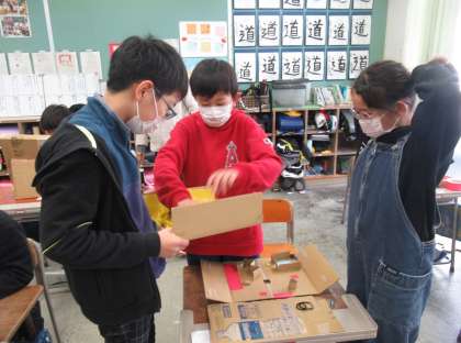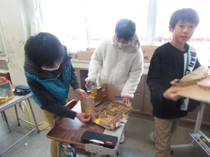 図画工作科では、段ボールを使ったわくわくプレイランドという迷路を作りました。ほとんど完成していたので、最後は手直しをして遊べるようにしました。