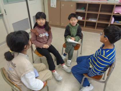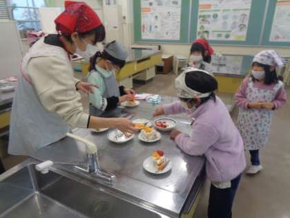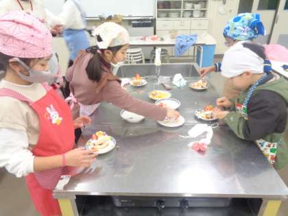 お楽しみ集会で、初めてのケーキ作り。飾りもきれいに付け、とても美味しそうです。教室に帰っていろいろなゲームでも楽しました。