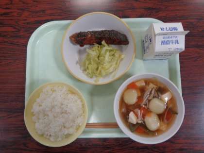 今日の献立は、ご飯 すいとん 魚のえごまだれ ゆでキャベツ 牛乳 でした。