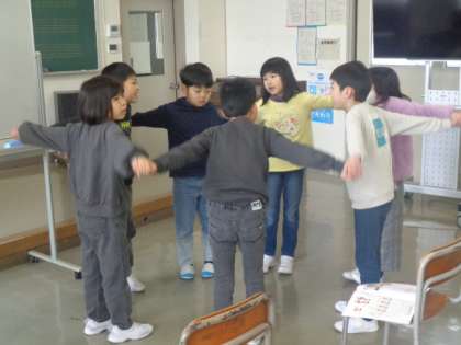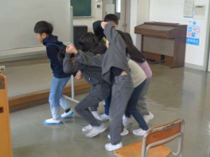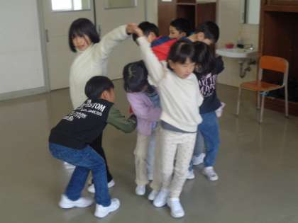 「なべなべ そこぬけ そこがぬけたら かえりましょ」歌に合わせてながら体を移動います。チームワークよく、上手く体を抜け出すことができたでしょうか。