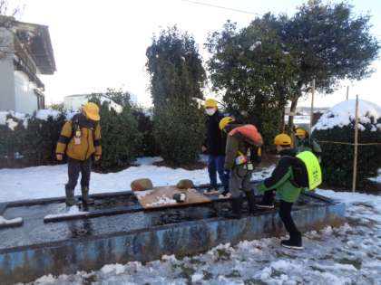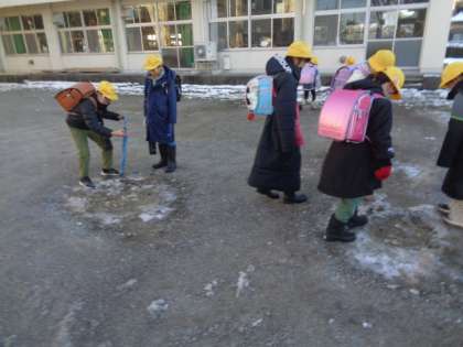 気温が低く、寒い朝を迎え、観察池や水たまりの水凍っていました。早速、池の氷の上に乗ってみる子供たちです。