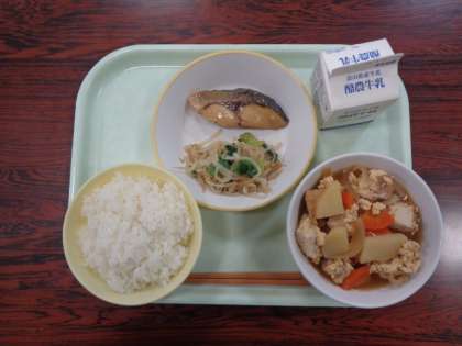 今日の献立は、ご飯  ふくらぎの西京焼き  厚揚げの錦とじ  塩ナムル  牛乳  でした。