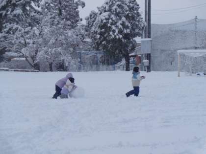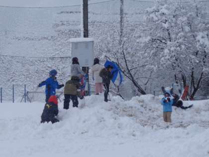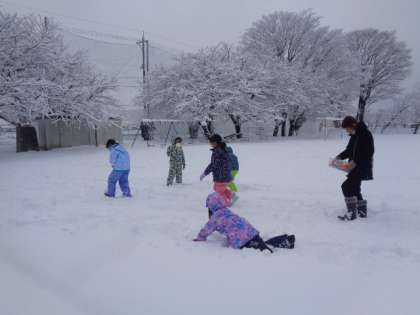 グラウンド一面の銀世界。雪遊びを大いに楽しんでいます。