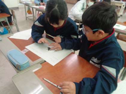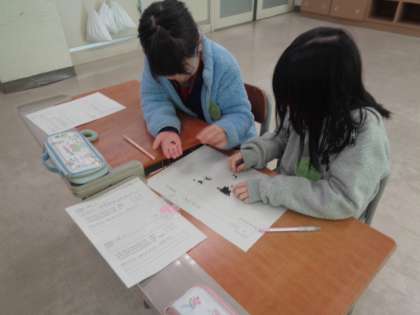 「たくさんあるひまわりやあさがおの種がいつくあるのか数えてみよう」ペアの友達と実際に種を動かしながら、正確に数える方法を考えています。