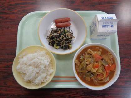 学校給食週間4日目。今日のテーマは「持久力アップ}」献立は、ご飯 スタミナカレーうどん あらびきウィンナー 鉄たっぷりサラダ 牛乳でした。 お昼の放送では、3年生以上の代表の人が調理員さんへの感謝の気持ちを作文で発表しました。