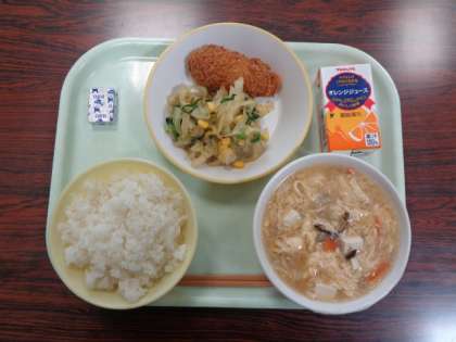 学校給食週間最終日。今日のテーマは「瞬発力アップ」です。献立は、ご飯 かき玉汁 ささみフライ コーン和え ポケットチーズ 超回復オレンジジュース でした。