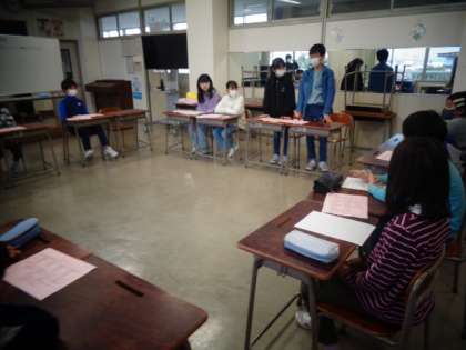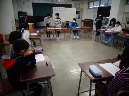 卒業を祝うプロジェクトに向け、4・5年の各担当グループから、3年以下の代表委員に内容の説明がありました。発表者も聞いている人たちも真剣に参加していました。
