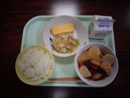 今日の献立は、ご飯  おでん  厚焼き卵  ベーコンとエリンギのソテー  牛乳  でした。