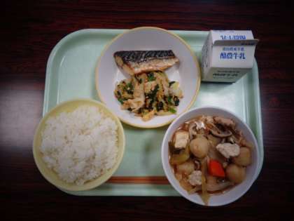 今日の献立は、ご飯 ちゃんこ鍋 鯖の塩焼き 炒り大豆和え 牛乳 でした。
