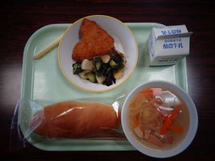 今日の献立は、コッペパン 鰺フライ マカロニスープ だいこんサラダ 棒チーズ 牛乳 でした。