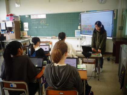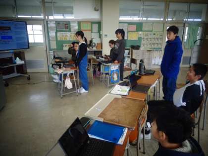 環境についてまとめたプレゼン発表を聞き、内容のよさについて話し合っています。