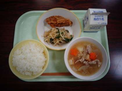 今日の献立は、ご飯 豚汁 魚のりきゅう揚げ もやしのおひたし 牛乳 でした。