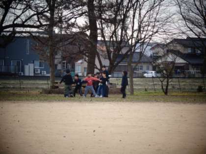 今日も2月とは思えない暖かさに誘われて、元気に遊ぶ子供たち。先生方も一緒です。