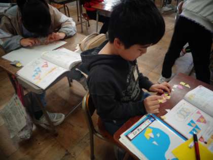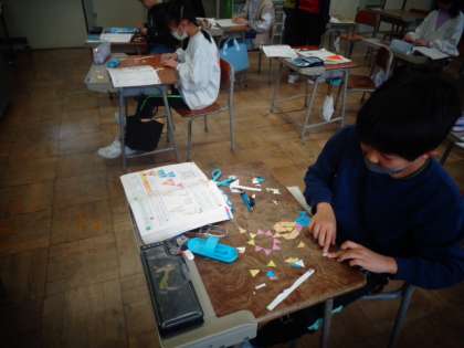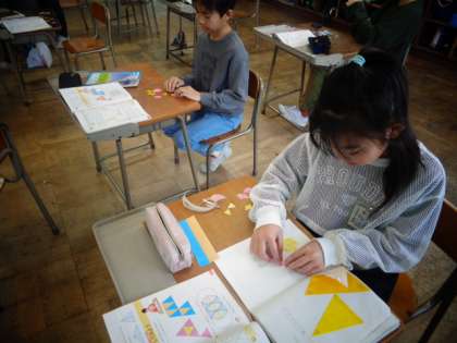 三角形を敷き詰めてできる形のおもしろさを味わっています。、