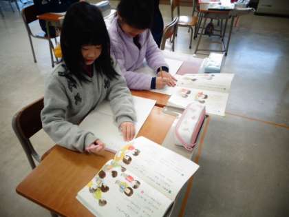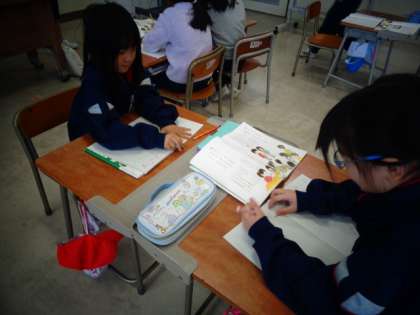 「これは なんですか?」教室の中にあるものをクイズで出題するためのヒントを、ペアにあなって考えています。
