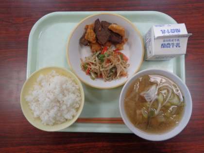 今日の献立は、 ご飯 たら汁 鶏肉とレバーのカレー風味 ナムル 牛乳 でした。