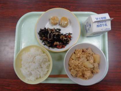 今日の献立は、ご飯  卵とじ  ひじきの炒めに  人参シュウマイ  牛乳  でした。