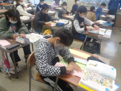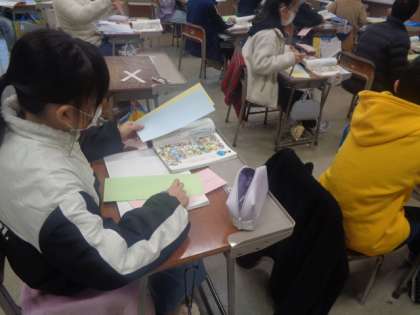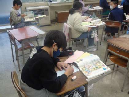 「いつ」「どこで」「だれが」「何をした」教科書の挿絵から思い浮かぶ言葉をカードに書き、ランダムにつなげてできる文章のおもしろさを味わっています。