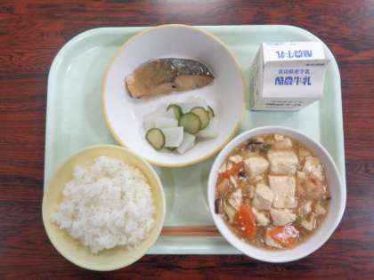 今日の献立は、ご飯  えびと豆腐のうま煮  ふくらぎの西京焼き  かぶのサラダ  牛乳  でした。