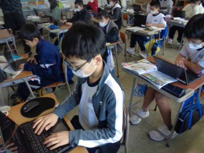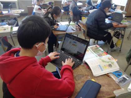 「森林のよさ」とは何か。PC場の付箋に意見をどんどん貼り付けています。資料で調べた内容も、自分の言葉で表すよう気を付けています。