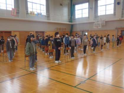 在校生全員が集まった初めての卒業式の練習。座席の位置や式への心構えを確認し、呼びかけや歌の練習を行いました。先に練習を始めている代表の人たちに引っ張られながら、大きな声で合わせました。担当の先生からは君が代の歌詞の意味説明もあり、真剣な態度で練習を行いました。