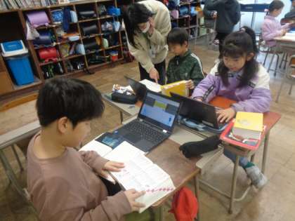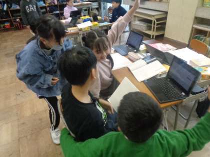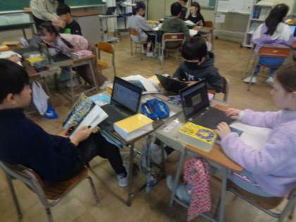 物語の初発の感想を話し合ったり、難しい言葉の意味調べをしたりしています。辞書の引き方も手慣れたものです。