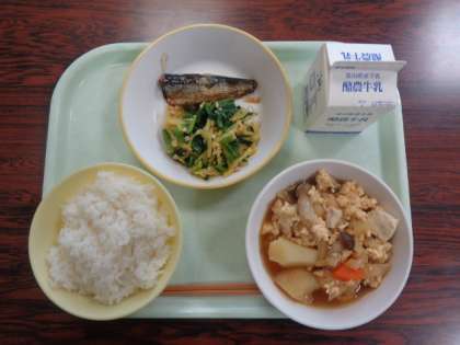 今日の献立は、ご飯 親子煮 鰯の土佐煮 納豆和え 牛乳 でした。