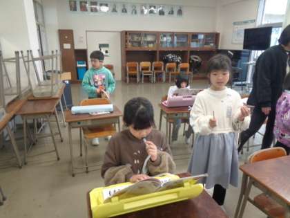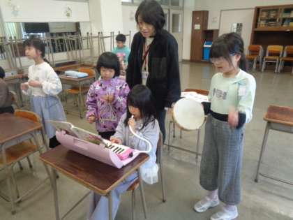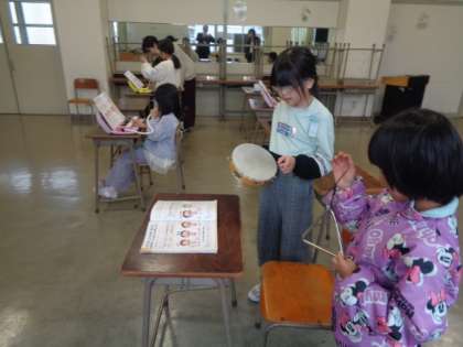 「トンくるりん」「パンくるりん」音のリズムに合わせながら、楽器で演奏しています。