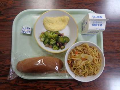 今日の献立は、コッペパン 焼きそば オムレツ ビーンズサラダ ポケットチーズ 牛乳 でした。