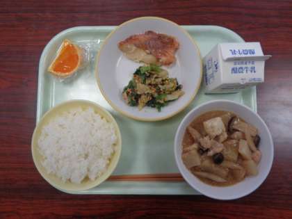 今日の献立は、ご飯 根菜のごま煮 赤魚の塩焼き 炒り大豆和え きよみオレンジ 牛乳 でした