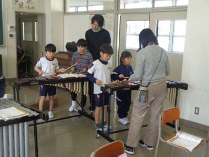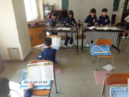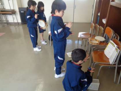 木琴、鉄琴、鍵盤ハーモニカ、打楽器をグループごとローテーションしながら変わり、演奏しました。全員がいろいろな楽器を体験でき、とても楽しそうです。
