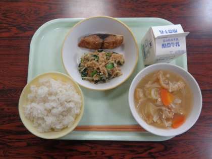 今日の献立は、ご飯 五目汁 ふくらぎの蒲焼き はりはり和え 牛乳 でした。
