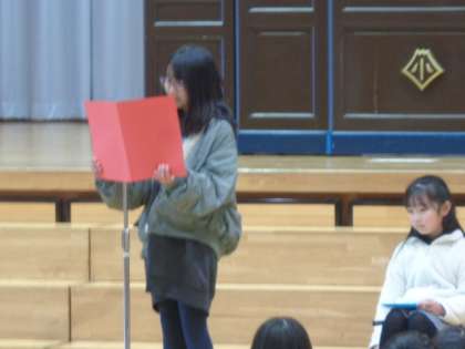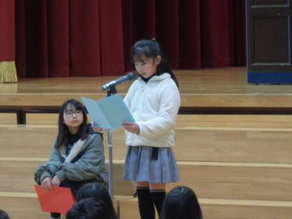 校長先生から、1年間の自分の成長に喜び、感謝の気持ちを大切にするといったお話があり、子供たちは真剣に聞いていました。3学期にがんばったことでの発表では、練習を繰り返しながら上手くなったことや、次の学年にもつなげていきたいことを伝えました。