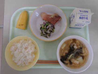 今日の献立は、ご飯、牛乳、赤魚の塩焼き、
