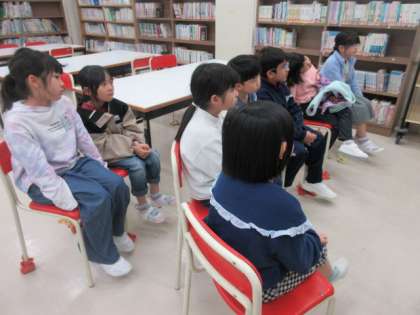 図書室へ行きました。読み聞かせをとっても楽しみにしている子供たち。図書室の使い方を確認した後、司書の先生に本を読んでもらいました。時々クスッと笑いながら楽しく聞いていました。