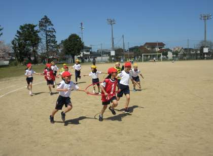 次にフラフープを持ちながら、チームになって追いかけるおにごっこをしました。