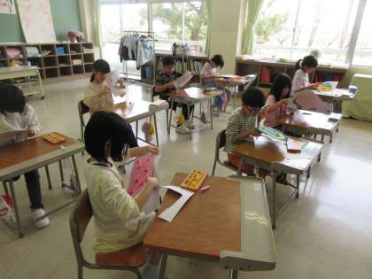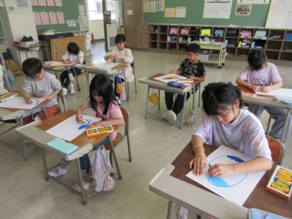 「ふしぎなたまご」を描きました。中から生まれる物をいろいろ想像しながら、色や模様を工夫して描きました。「わたしのたまごからは〜が生まれるんだ」「ぼくはかっこいいたまごにしよう」など、自分の思いを大切にしながら、描いていました。