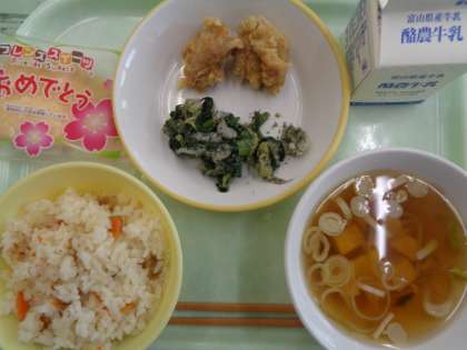 今日の献立は、ちらしずし、鶏肉のから揚げ、よごし、すまし汁、