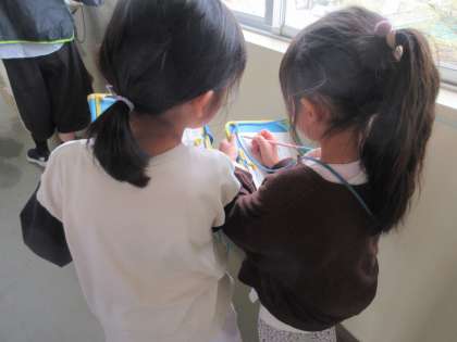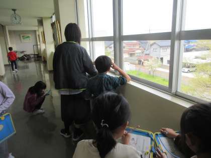 社会科では、学校のまわりについて学習しています。今回は、3階から学校の周りには何があるのかを見渡してみました。