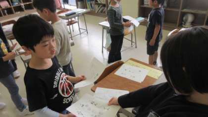自己紹介カードを持って、友達とカードを交換しながら自己紹介をしました。子供たちは、授業が終わった後も、自分の好きなものを友達と話したり、カードの絵を見て楽しんだりしていました。