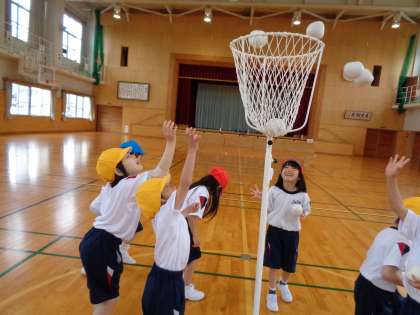 今日は、1年生だけで玉入れの練習を行いました。上に投げる練習をした後、かごを使って練習しました。子供たちは、全ての玉がかごに入るまで力を合わせて頑張っていました。