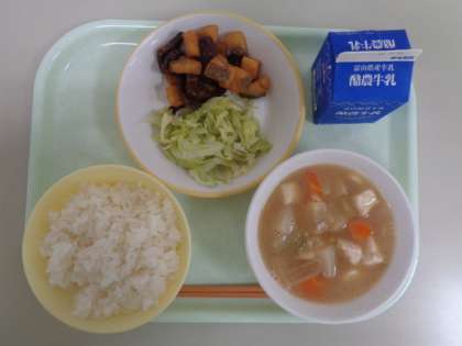 今日の献立は、ごはん、魚とレバーの揚げからめ、ゆでキャベツ、