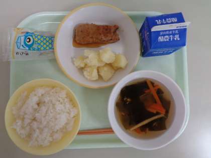 今日の献立は、ごはん、こいのぼりハンバーグ、こふきいも、