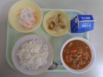 今日の献立は、カレーライス、福神和え、フルーツヨーグルト、