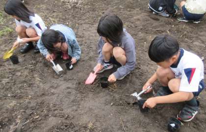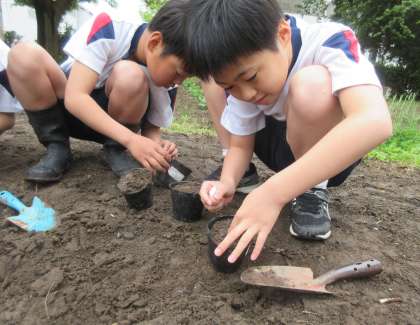 理科では、植物の成長についての学習を始めました。今回は、オクラとひまわりの種をまきました。