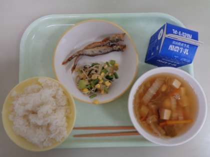 今日の献立は、ごはん、ししゃものから揚げ、コーン和え、白玉汁、