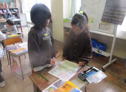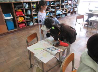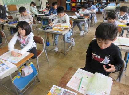 社会科では、市についての学習を始めました。富山市の地図から八幡小学校がどこにあるのか探しました。地図には、白い丸がいくつも書かれており、それが小学校の位置を表しています。